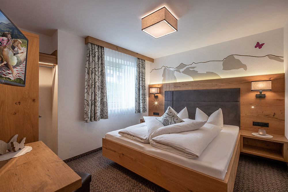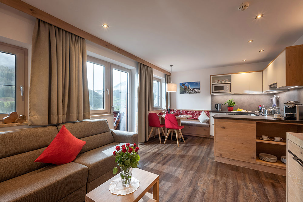 Our spacious apartments enchant with cosiness, authentic Tyrolean charm and an incomparably beautiful panoramic view. Perfectly adjusted to the needs of families and friends, each apartment features a fully equipped kitchen, a comfortable bathroom, comfortable beds, a radio, a telephone, satellite TV, a balcony or terrace as well as a homey sitting area and plenty of space for two to six persons.